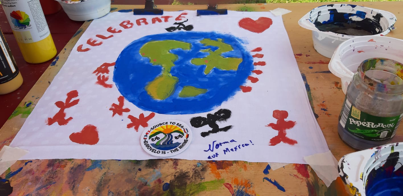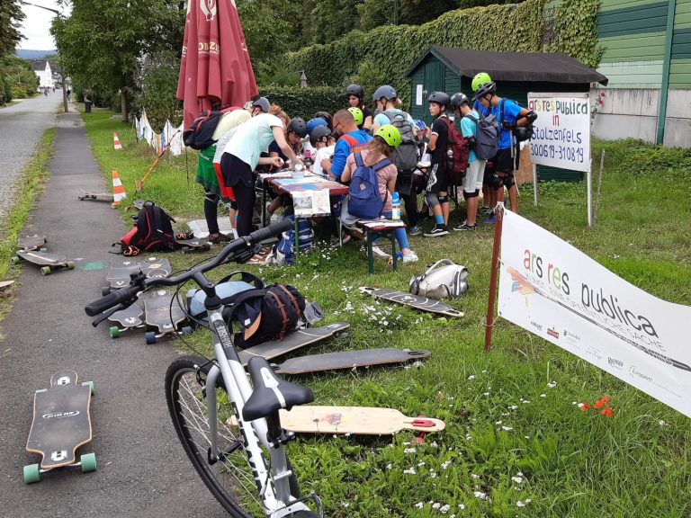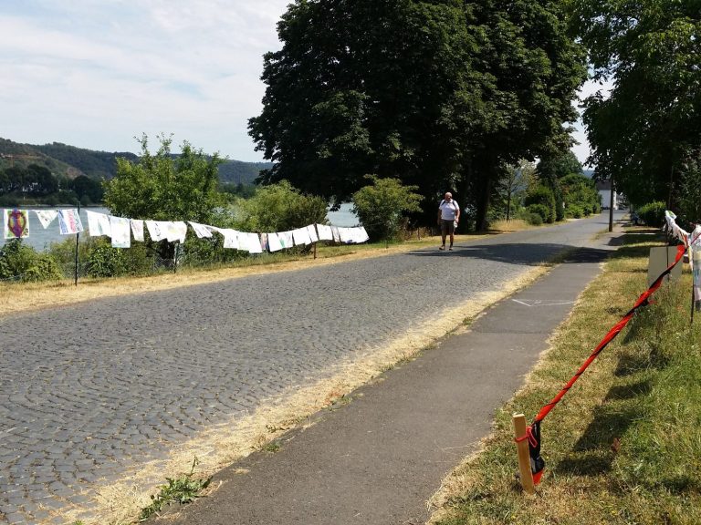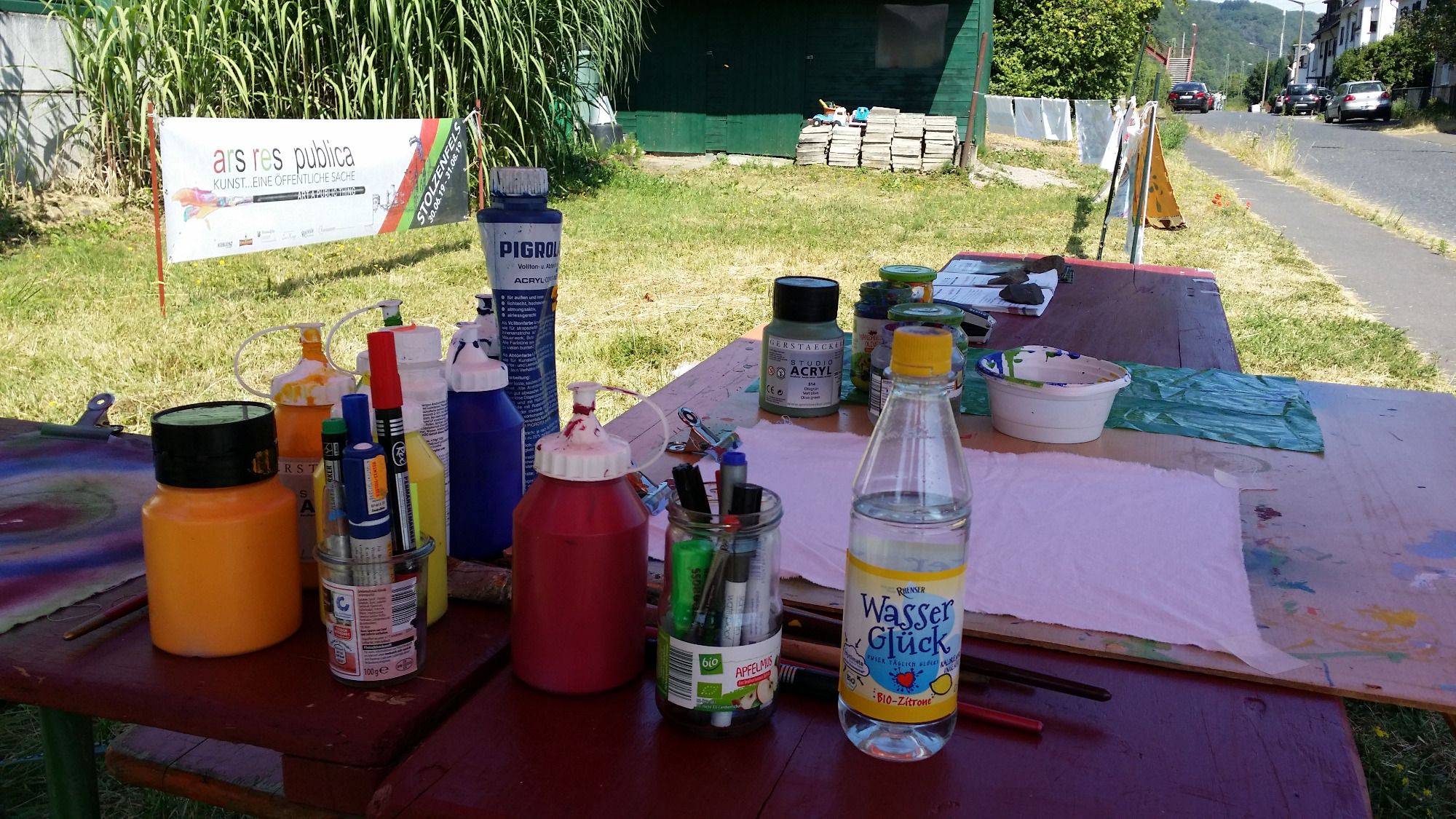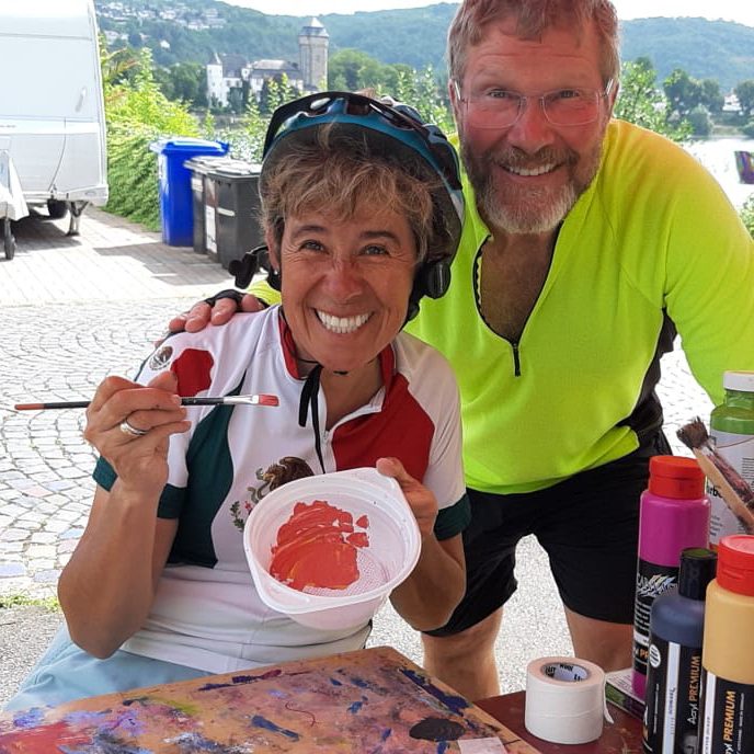 2019 fand die erste Ausstellung von ars res publica in Koblenz statt. Über 350 Kunstwerke wurden in dem 2 monatigen Kunstprojekt am Rheinradweg Rotterdam--Basel von durchfahrenden internationalen Bürgern und Bürgerinnen geschaffen. Hier auf dem Bild ein Paar aus Kalifornien. Man sieht die Begeisterung!